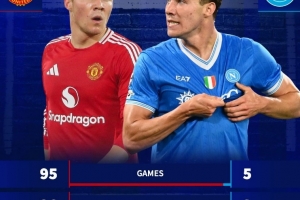德转也盘点了霍伊伦在曼联、那不勒斯效力时期的进球数据,具体如下: