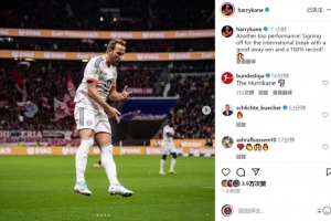 凯恩社媒晒出比赛照片,并写道:“又一场顶级表现!以一场精彩的客场胜利和全胜战绩迎来国际比赛日。”