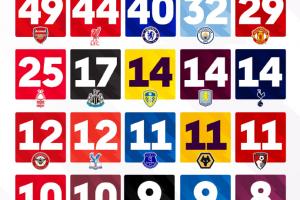 英超各队的最长连续不败场次一览 ​​​