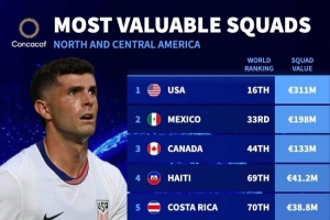 体育资讯10月12日讯德国转会市场网公布中北美及加勒比海足联国家队身价排名,美国队以3.11亿欧元总身价位居榜首,墨西哥(1.98亿欧元)与加拿大(1.33亿欧元)分列二、三位。